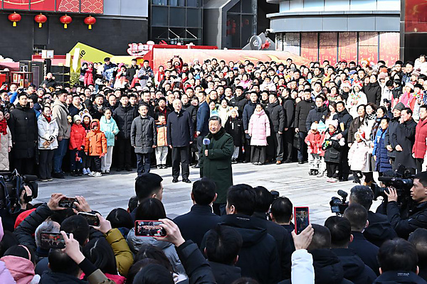 Chinese President Xi Jinping, also general secretary of the Communist Party of China Central Committee and chairman of the Central Military Commission, extends Spring Festival greetings to Chinese people at home and abroad ahead of the festival while visiting the Longfusi commercial area in Dongcheng District of Beijing, capital of China, Feb. 10, 2026. Xi visited primary-level officials and residents in Beijing during a two-day inspection tour from Monday to Tuesday. [Xinhua/Yan Yan]
