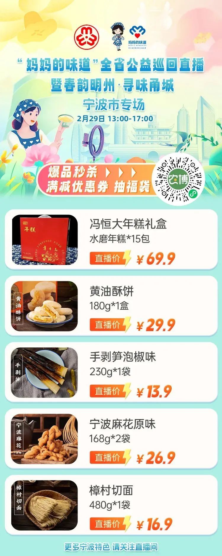 本次市级公益直播将于2月29日13:00-17:00进行,届时妇联娘家人、巾帼达人主播、巾帼共富工坊负责人、非遗传承人、商家主体代表等人员都将齐聚直播间,为大家带来宁波市“妈妈的味道”代表性农产品、手工艺品,还将发放满减优惠券福利,并开展爆品秒杀活动,如宁波小桃酥、宁波麻花、宁波三北豆酥糖等宁波特色仅需9.9元,大家记得锁定直播间~