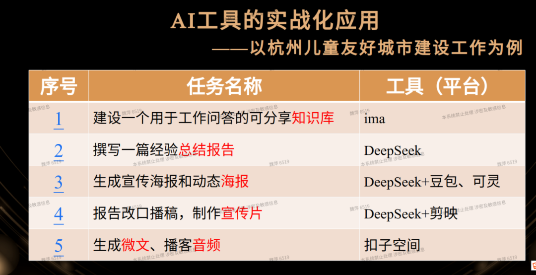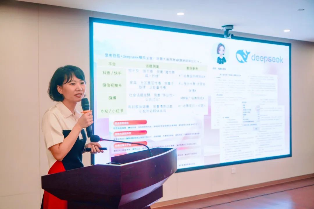 来自省妇女干部学校的赵盾老师现场演示了AI工具的实战化应用。通过一个儿童友好城市建设工作案例,介绍了如何运用ima、DeepSeek、可灵、剪映等AI工具在知识库搭建、文稿撰写、海报视频制作等方面的实战技巧。