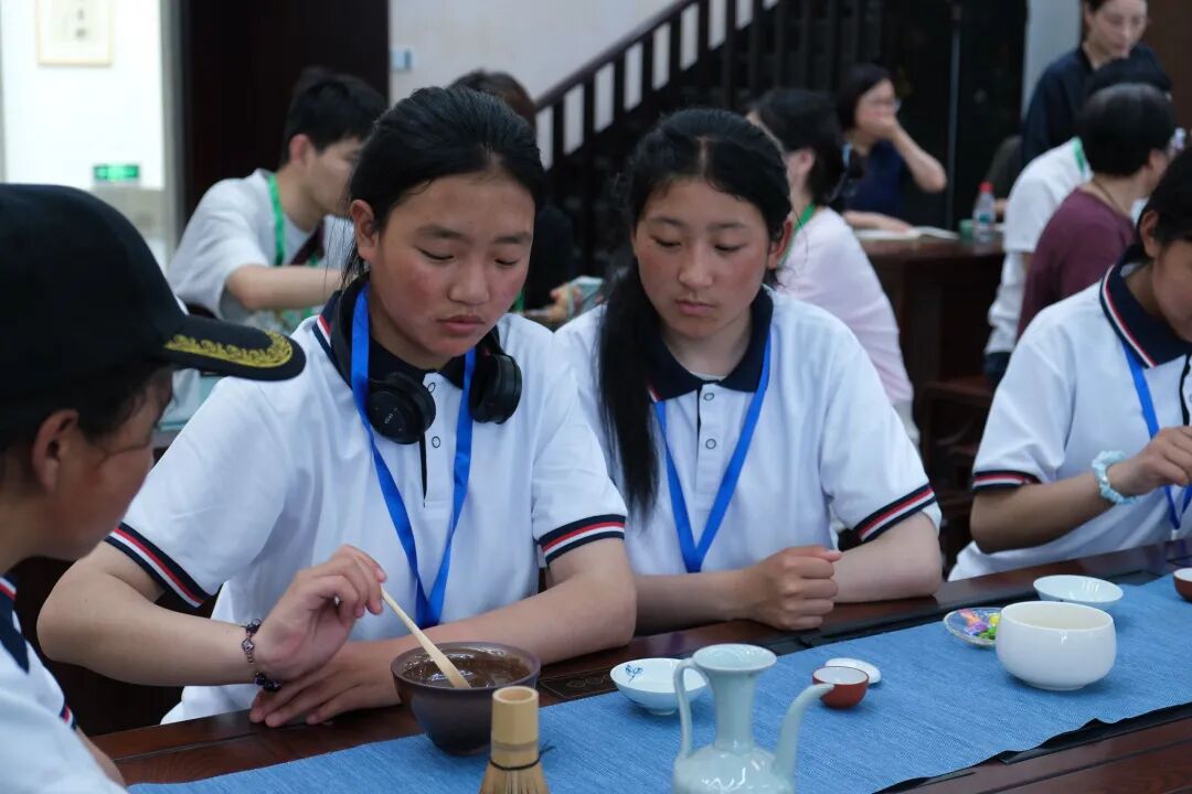 在李碧葱茶文化实验室,茶文化课程精彩呈现。同学们了解中国茶文化的发展脉络,从神农尝百草的故事到藏族酥油茶的来源,再到茶马古道的历史,茶的世界徐徐展开。在宋韵点茶和花式调饮的沉浸式体验环节,孩子们积极参与,纷纷表示学到了非遗技艺,收获满满。
