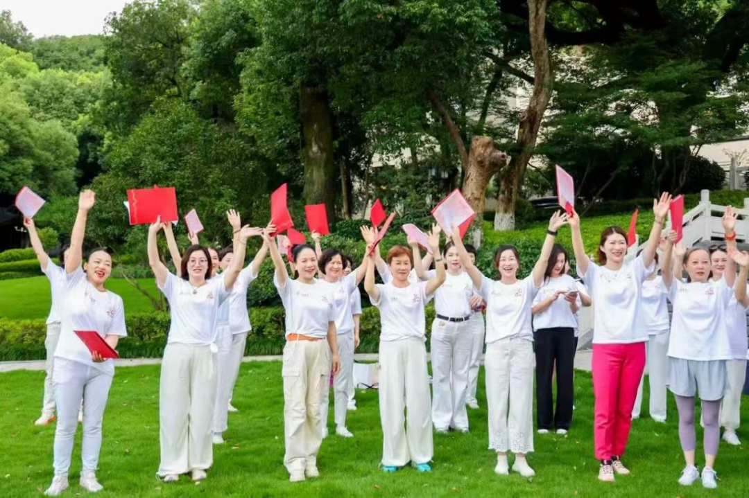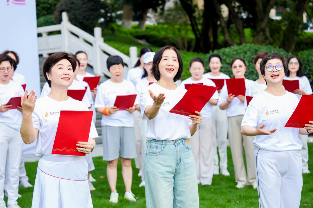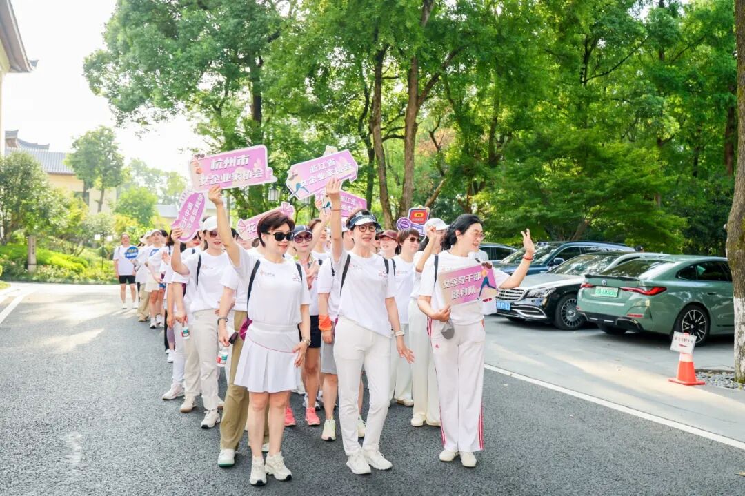 省直机关女领导干部健身队队长鲁维明、省人大常委钱晓芳,省女企业家协会会长屠红燕、顾问李虹、常务副会长、杭州市女企协会长徐力等近百位巾帼翘楚,身着统一文化衫,以步履丈量湖山,用歌声礼赞时代。