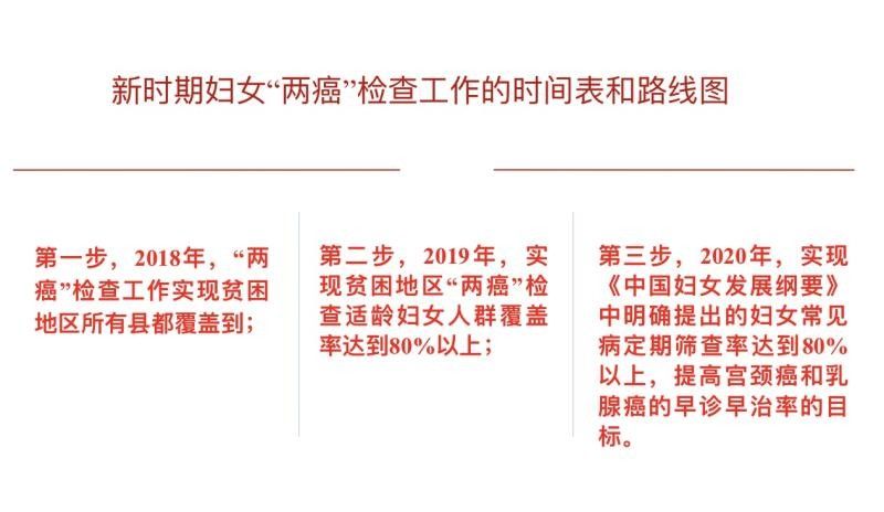 党和国家高度重视妇女健康,2009年将农村妇女“两癌”免费检查纳入国家重大公共卫生服务项目,由国家卫生健康委(原卫生部)、财政部、全国妇联共同实施。截至2017年底,为7398万农村适龄妇女进行了免费宫颈癌检查,为1364万农村适龄妇女进行了免费乳腺癌检查。项目的实施,促进了妇女“两癌”早发现、早治疗,切实提高了妇女健康水平,深受妇女群众欢迎,已成为各级党委政府关心关爱妇女的德政工程、民心工程。